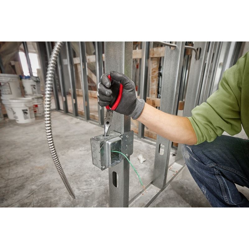 The Milwaukee 8in Long Nose Pliers (USA) provide professionals with a tool that delivers the best grip and easiest cuts. These needle nose pliers feature cross-hatched, laser-hardened teeth for maximum grip when pulling or twisting. The optimized pivot point is designed to give the best leverage during tough cuts. The long-nose pliers are engineered to deliver the smoothest open and close experience from the start, with no break-in period required. For additional versatility, these pliers feature a reaming head for 1/2in – 1in conduit and a fish tape puller. Pliers are tether ready and offered in both dipped grip with a split-ring hole and comfort grip with a lanyard hole. The Milwaukee Long Nose Pliers are made in USA with best-in-class manufacturing technology and USA-sourced materials, including durable, press-forged steel, and are backed by a complete Lifetime Guarantee.